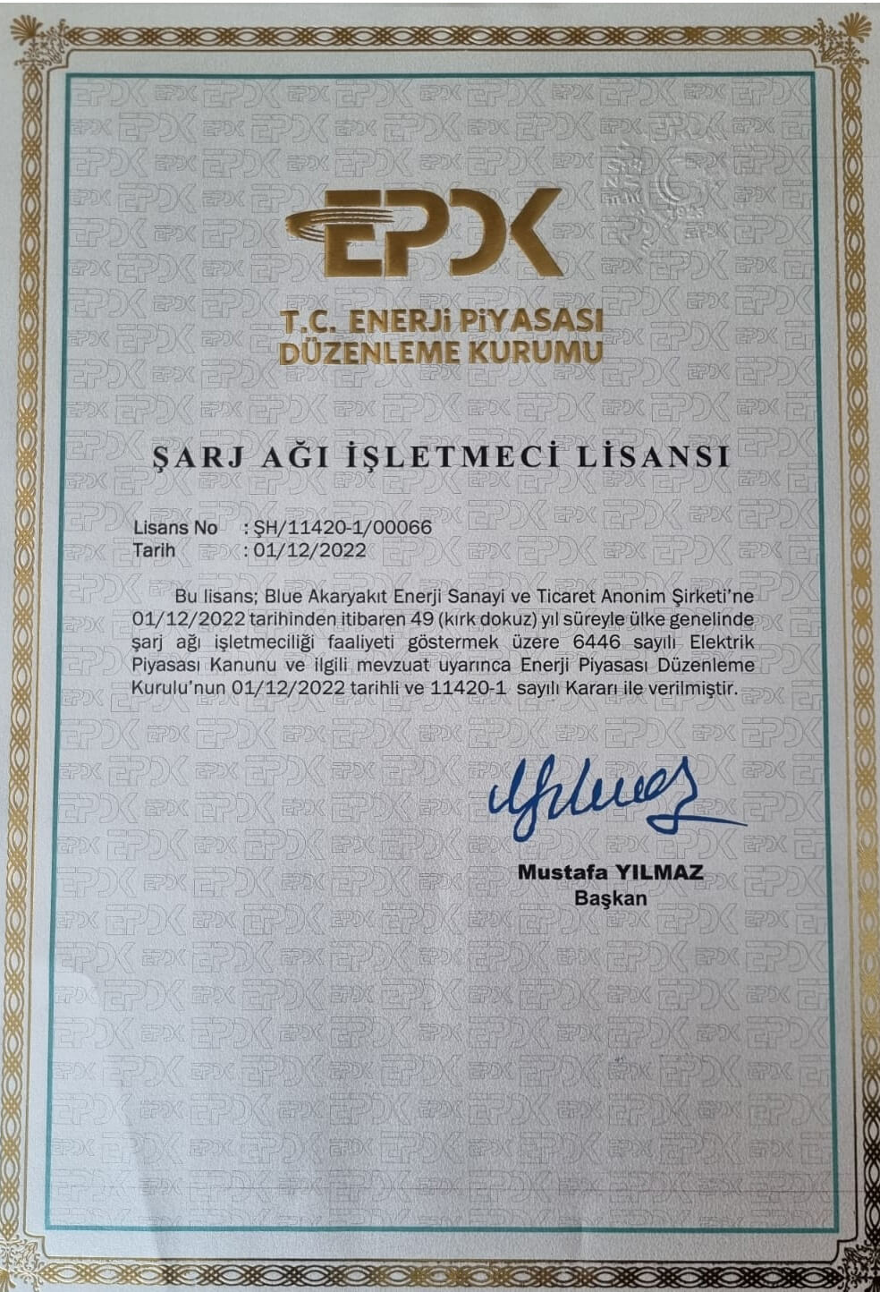 Blue Enerji, 6446 sayılı Elektrik Piyasası Kanunu ve ilgili mevzuat uyarınca Enerji Piyasası Düzenleme Kurulu’nun 29/09/2022 tarihli ve 11255 sayılı Kararı ile; 49 yıl süreyle ülke genelinde şarj ağı işletmeciliği faaliyeti göstermek üzere, lisans sahibi olmuştur. Lisans no: ŞH/11420-1/00066